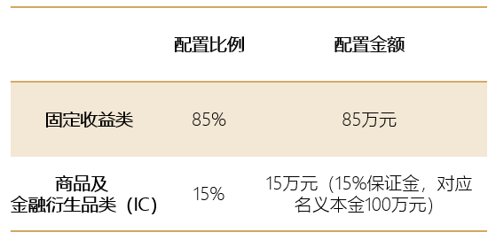 假设第一天老王固定收益类赚了100元,IC赚了1万元,此时他的固收类市值为85.01万元,衍生品类名义价值为101万元。假设两类资产的波动率保持不变,若老王能接受的风险在亏2.4万元到赚2.4万元之间,并且假设老王选择不对固收类资产调仓,他需要降低IC多投仓位: