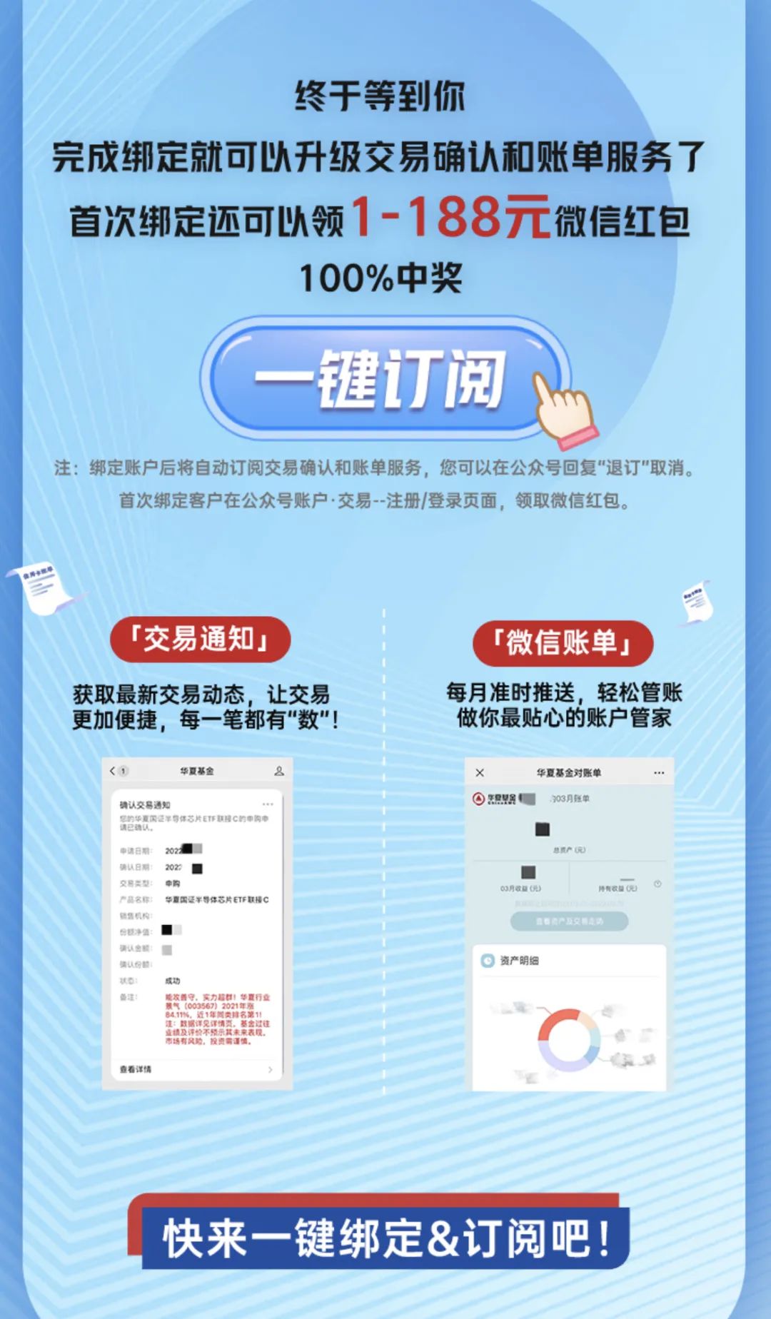 1、交易确认和月度账单仅针对购买过华夏基金产品的客户,绑定后将自动订阅上述服务。如需取消,您可以在华夏基金微信公众号对话框内回复"退订"取消订阅。