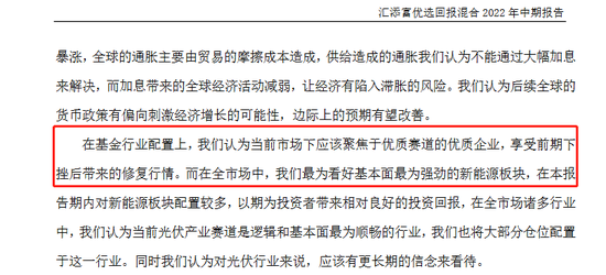 在今年半年报中,基金经理提到“当前市场下应该聚焦于高景气行业的优质企业”,所以持仓集中于当前最为景气的新能源车、光伏等板块。