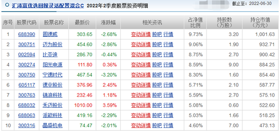 “汇添富优选回报基金”二季度前十大重仓股基本以新能源股票为主,分别是固德威、迈为股份、比亚迪、阳光电源、宁德时代、德业股份、锦浪科技、禾迈股份、派能科技、晶盛机电。