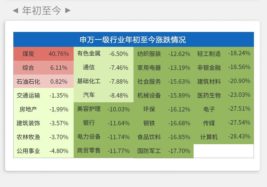 年初至今煤炭、综合、石油石化板块走高,计算机、传媒、电子等板块领跌。