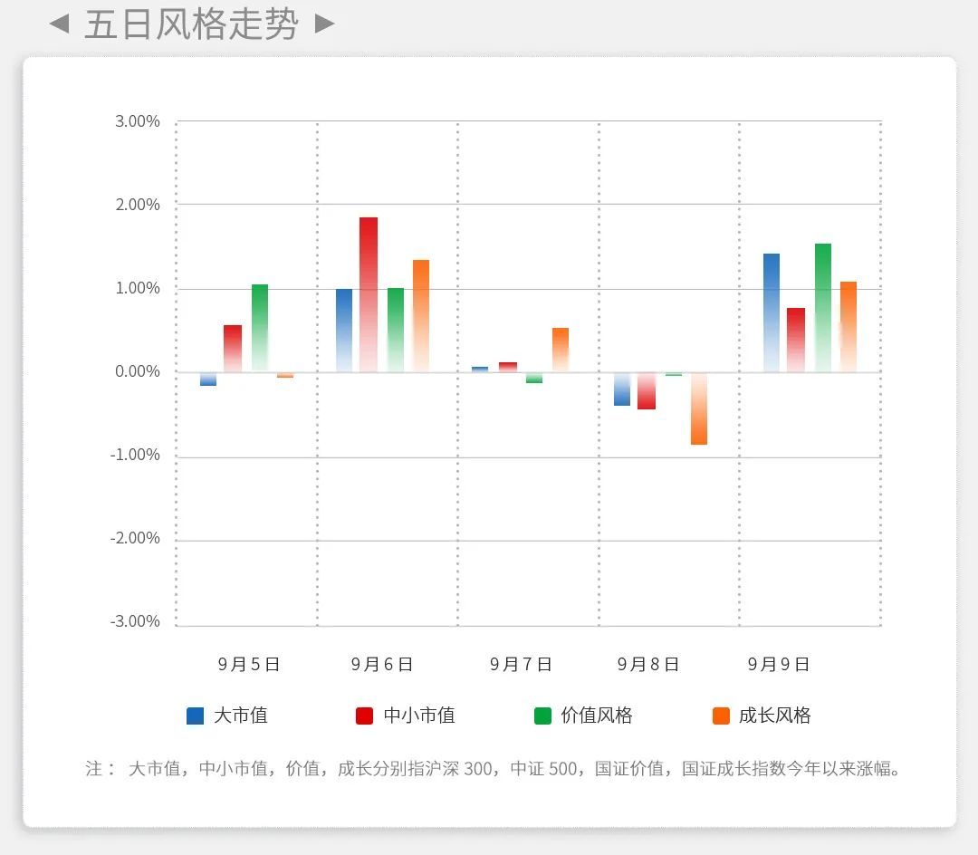 中小市值相对大市值占优,价值风格相对成长风格占优。
