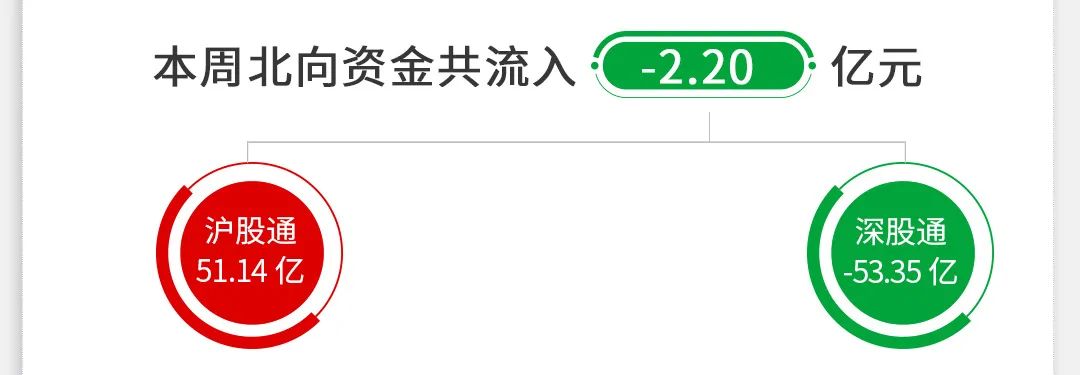 北向资金一周累计净流出2.20亿元,其中沪股通净流入51.14亿元,深股通净流出53.35亿元。当周北向资金日均成交额约890.62亿元,比上周缩量两百亿。