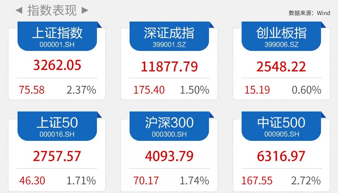 当周上证指数累计涨2.37%报3262.05点,深证成指涨1.50%报11877.79点,创业板指涨0.60%报2548.22点。